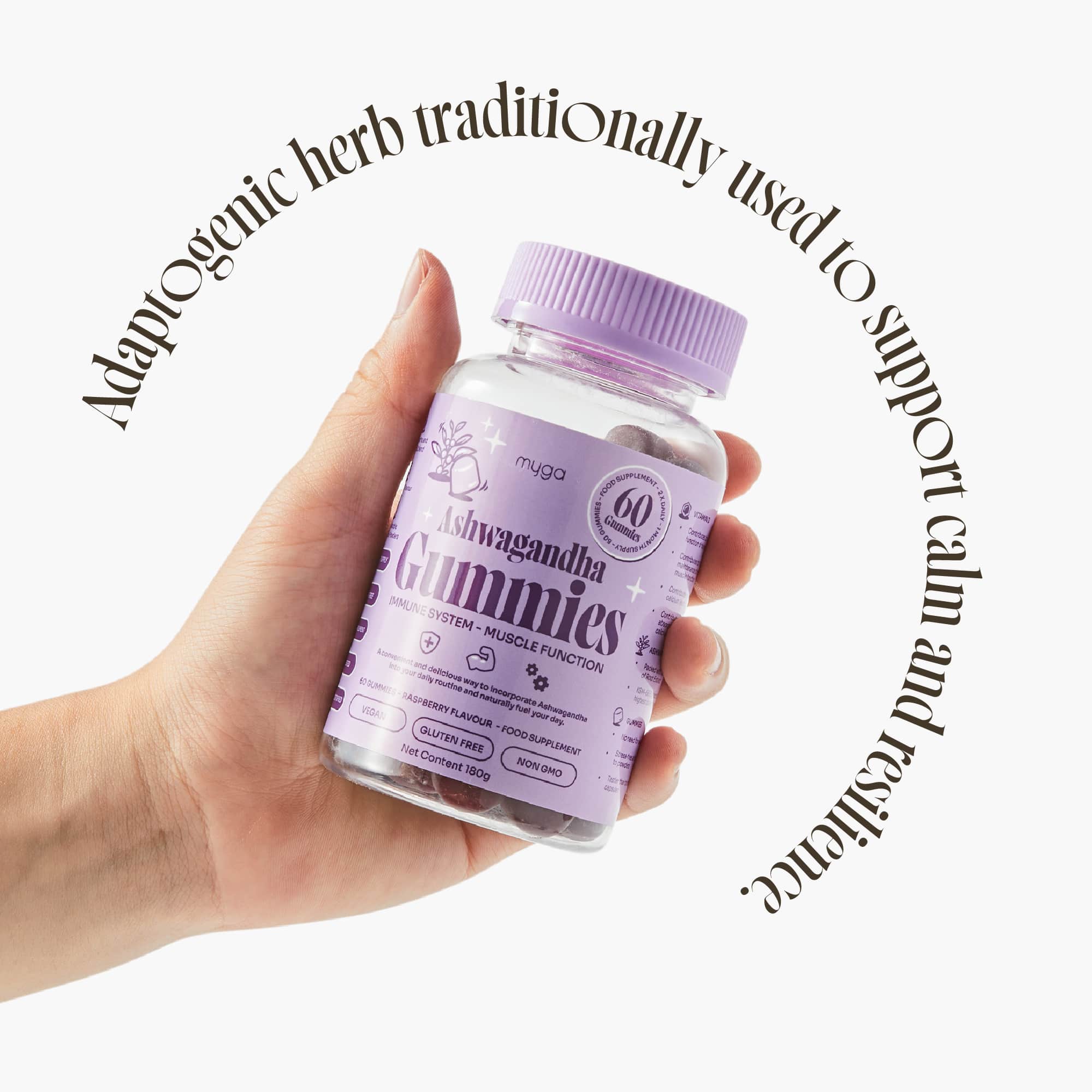 Easy to integrate into your daily routine, our Myga Ashwagandha Gummies combine Ashwagandha root extract with vitamin D in a delicious raspberry-flavoured format. With their soft texture and gentle taste, they offer a convenient alternative to powders or capsules, perfect for moments when you need support without interruption.