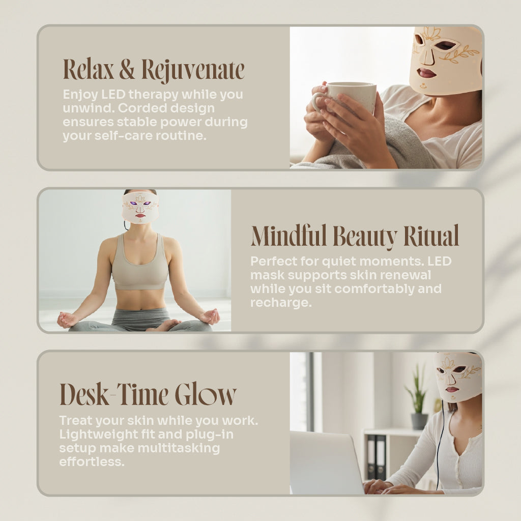 Discover a skincare ritual rooted in light. The Myga LED Face Therapy Mask uses advanced light technology and NIR (Near Infrared) to support skin clarity, calmness, and radiance, all from the comfort of home. With 100 high-performance LED beads and 7 light colour modes, this flexible, wearable mask gently enhances your complexion while you rest, meditate, or simply breathe.