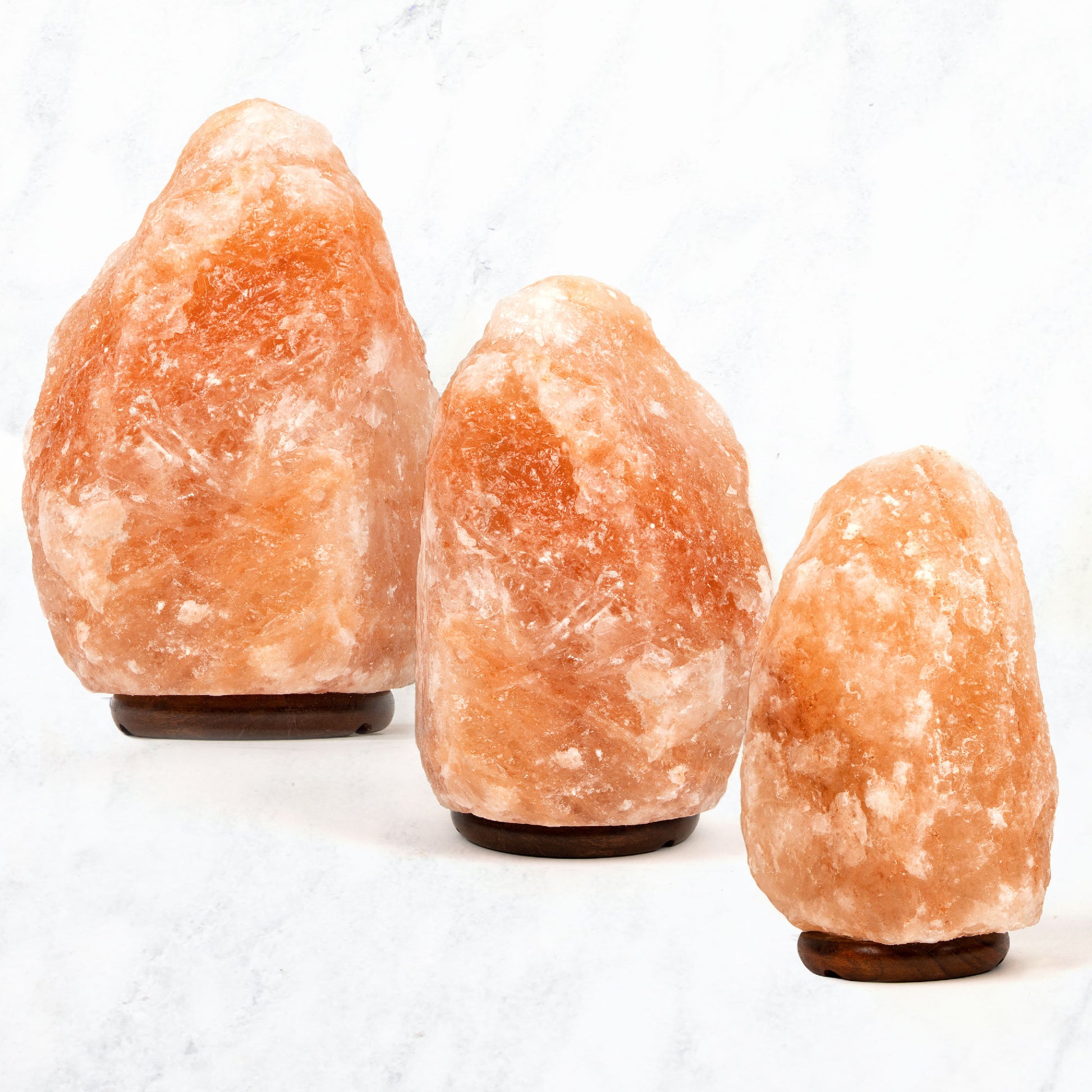 Hand-carved from authentic pink Himalayan salt found only in Pakistan, these stunning items are uniquely shaped and fully assembled on a smooth wooden base with a plug-in system that allows you to adjust the intensity of the light.