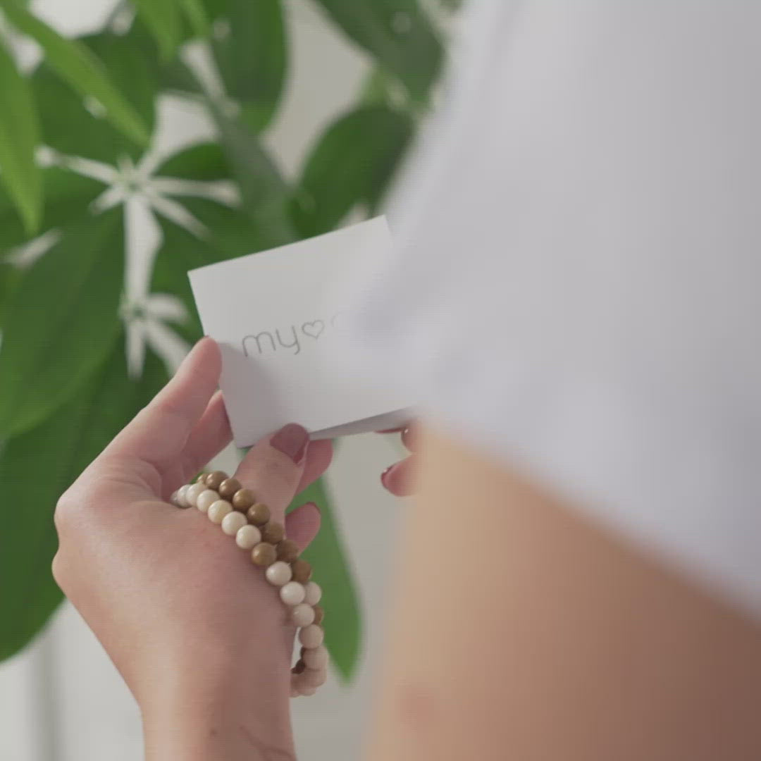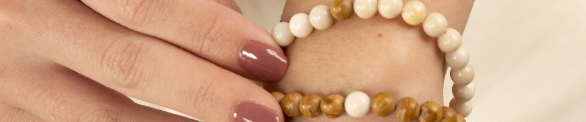 One of our beaded bracelets is made from natural wood, with one bead being white natural stone. The other bracelet, is made from natural stone with one bead being wooden. The wood and stone beads represent and bring you closer to earth and natural touch. The bracelet is on a strong elastic that will fit snug around any wrists.