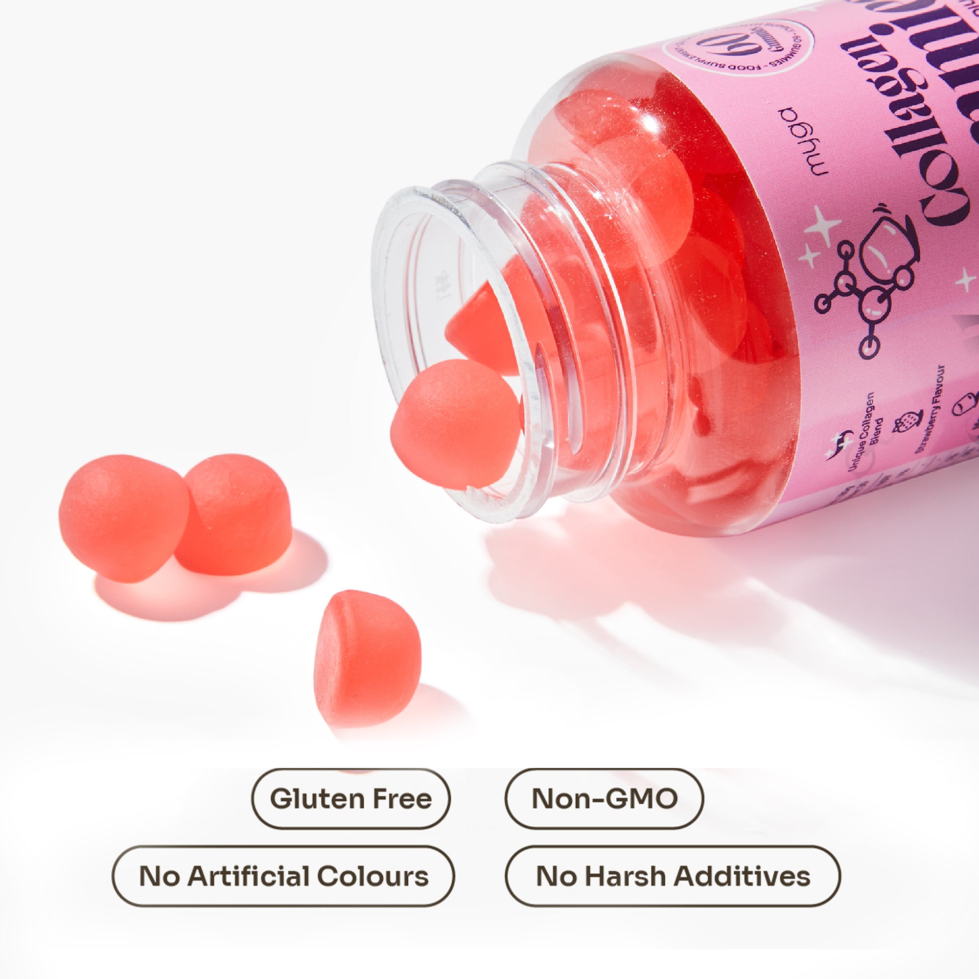 Our gummies are vegan, gluten free, Non GMO, and lab tested, free from artificial colours and fillers. Because what you put in your body matters.