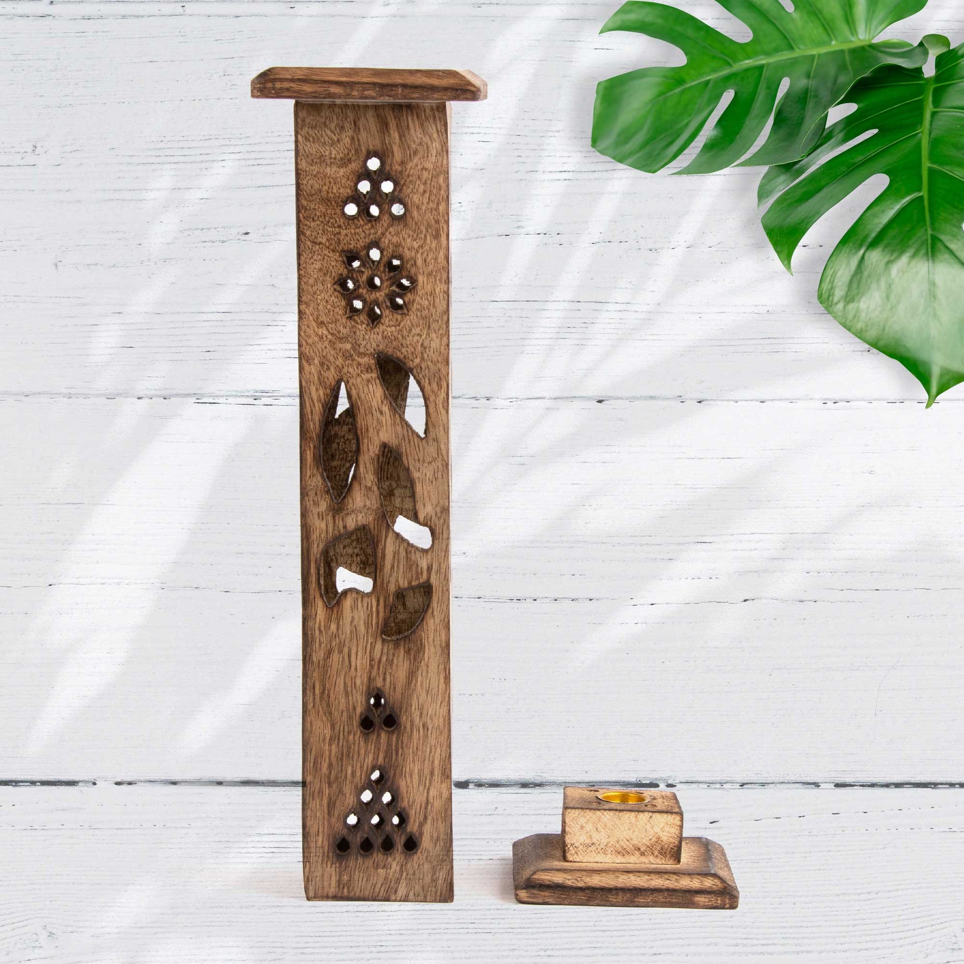 The wooden tower can burn four incense sticks at a time as well as one incense cone.