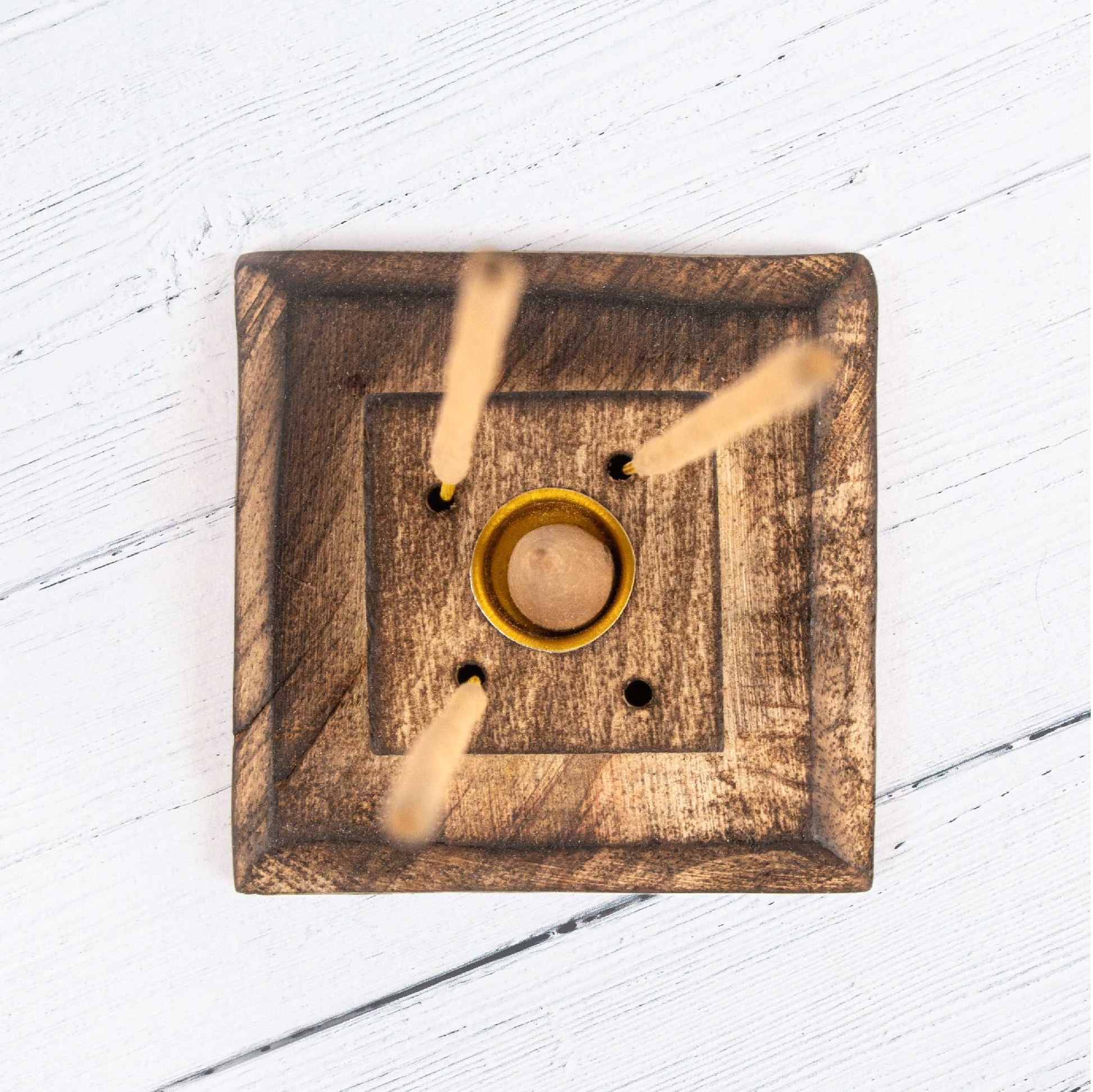 This incense burner in a shape of a squared tower is hand carved in India. The carved flower on top provides nine delicate cut-outs for the smoke to rise through. Each of the 4 sides are carved into a beautiful design.