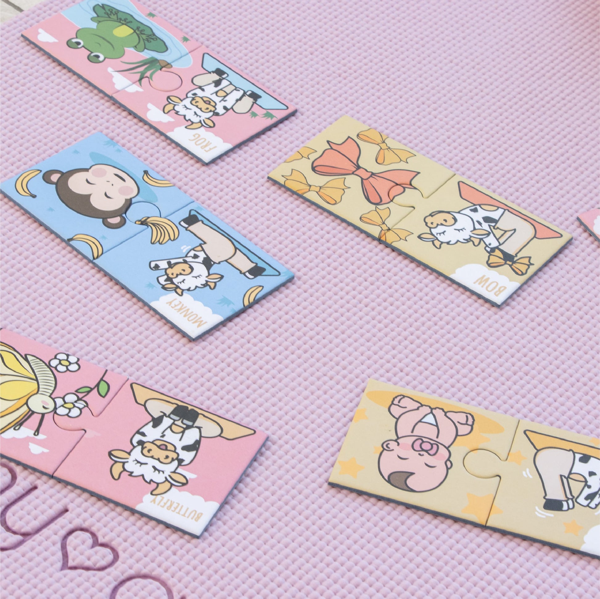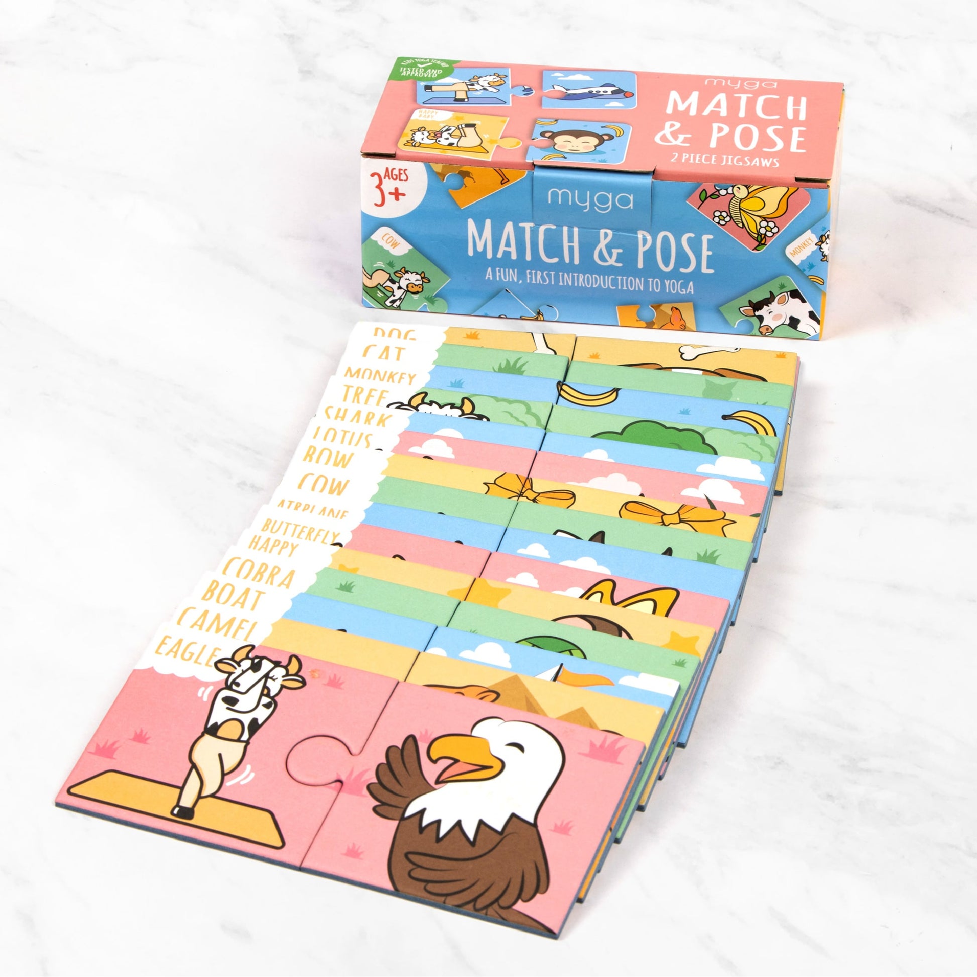 The colourful box consists of 32 cards, with each card having a matching pair. Find the 32 matching puzzle pieces and then try to do the 16 yoga poses after successfully completing a match.