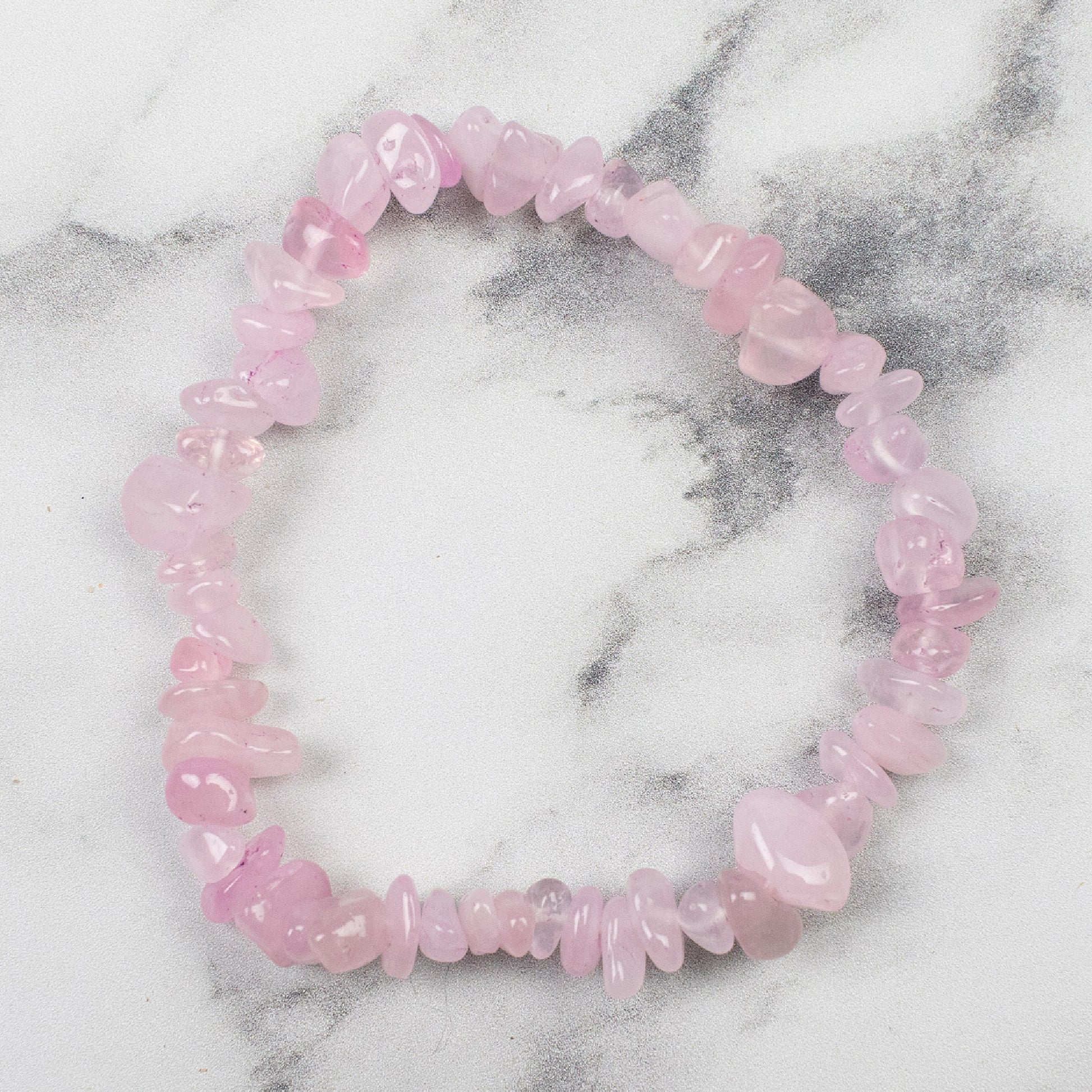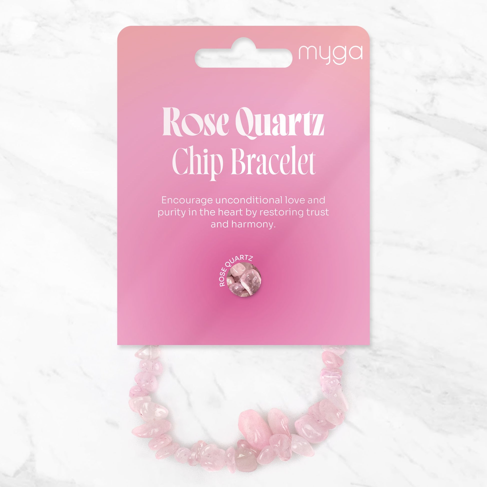 Myga introduces our Rose Quartz Chip Bracelet, the universal stone of love, hand carved to bring open your heart to unconditional love, and holding healing properties for restoring past events that may of prevented you off trusting. Our Rose Quartz Bracelet is known to encourage self love, friendship, deep inner healing, and feeling peaceful within your journey of life. It can be a calming and reassuring reminder, that will bring you comfort, and even help during times of grief.