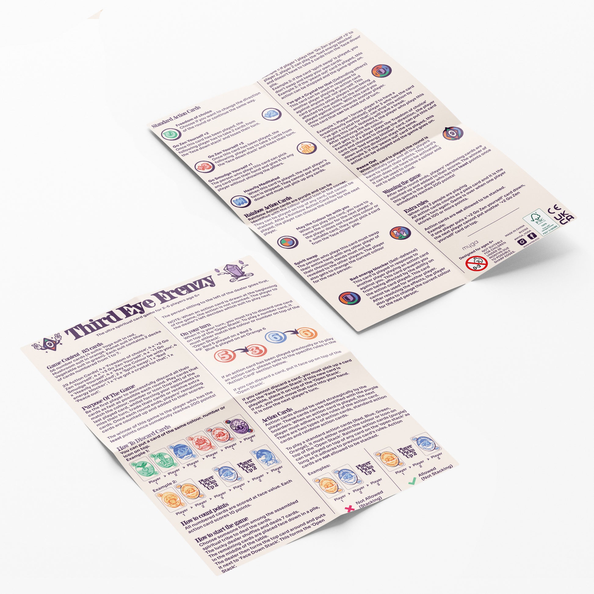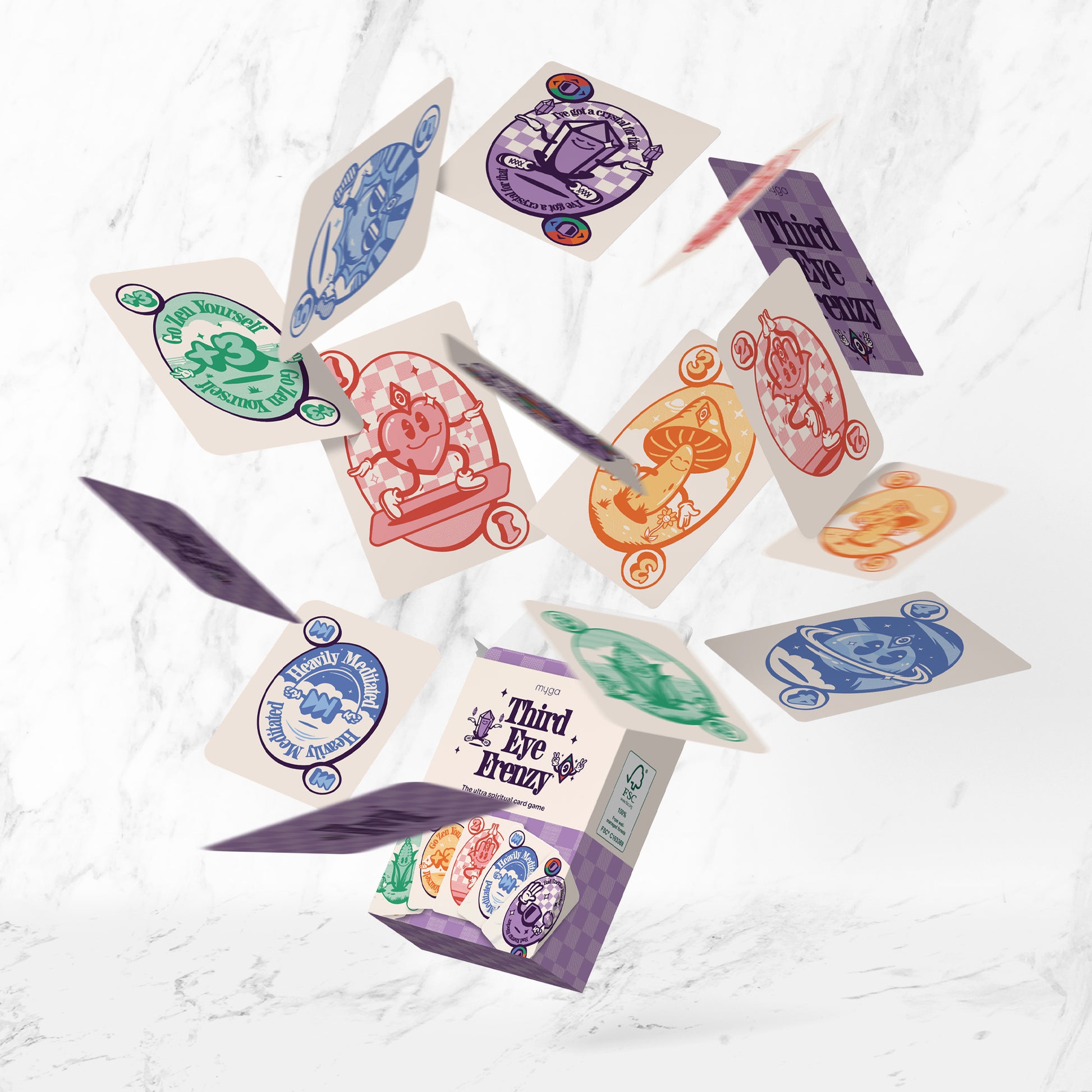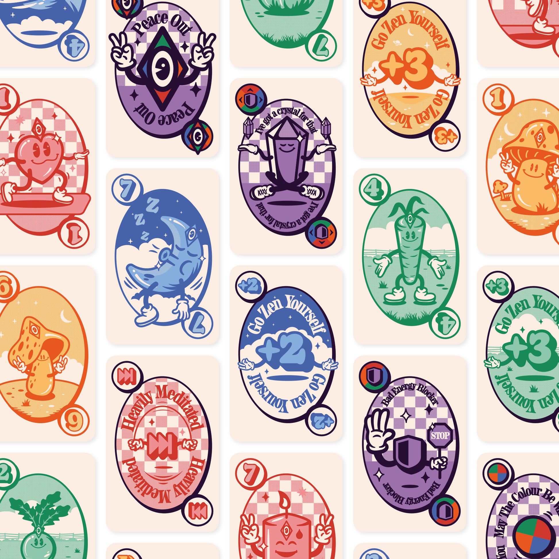 Get rid of all your cards as fast as possible and challenge your tribe with ultra spiritual moves such as ‘Go Zen Yourself’, ‘Heavily Meditated’, or ‘Bad Energy Blocker’ that utilise the colour, number, text, and illustration of the card.